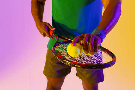 Image of midsection of african american male tennis player in violet and yellow neon lighting. Sport, movement, fitness and active lifestyle concept.