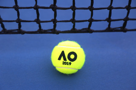 MELBOURNE, AUSTRALIA - JANUARY 23, 2019: Dunlop tennis ball with Australian Open logo on tennis court at Australian tennis center in Melbourne Park