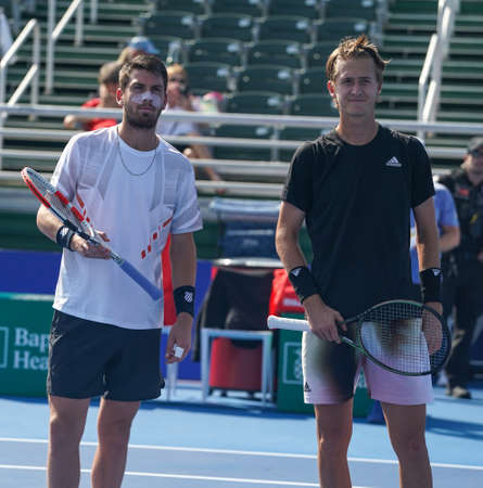 DELRAY BEACH, FLORIDA - FEBRUARY 18, 2022: Cameron Norrie of Great Britain (L) and Sebastian Korda of USA in action before quarter-final match at the 2022 Delray Beach Open tournament in Florida