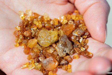 Beautiful pieces of amber in the hand of a girl