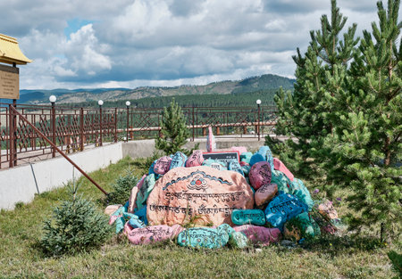Colored stones with buddhist mantras.Buddhist datsan Rinpoche Bagsha on mount Lysaya,Ulan-Ude,Russia