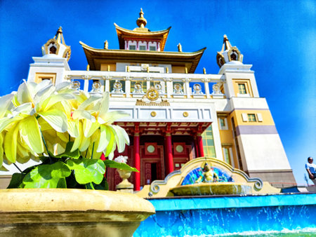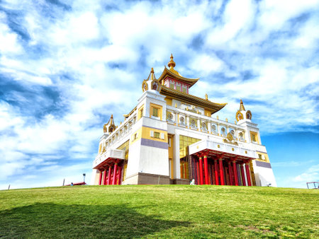 View of the Buddhist temple Golden Abode of Buddha Shakyamuni on a sunny September day. Elista, Russia