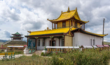 Bulgan, Mongolia - August 18, 2019: The buddhist monastery of Dashchoinkhorlon Khiid with yellow roof and statues.