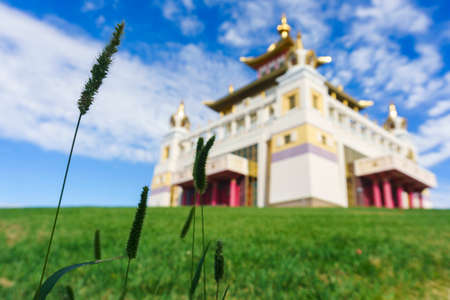 Elista / Russia - September 2018: beautiful rich temple Golden monastery of Buddha in the capital of Russian Buddhism on a bright sunny day blurred against the background of ears of grass