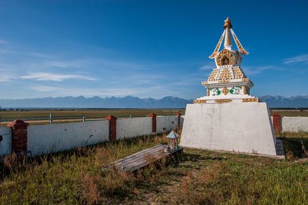 Ogoy Island, Baikal Lake, Russia- White Buddhist stupa and the baikal lake