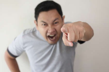 Photo image of funny Asian man showing cynical unhappy angry facial expression pointing forward giving warn