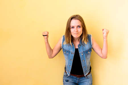 Beautiful girl with her hair standing on an isolated yellow background. She depicts with all her appearance the emotion of stubbornness and a little anger. It looks very nice.