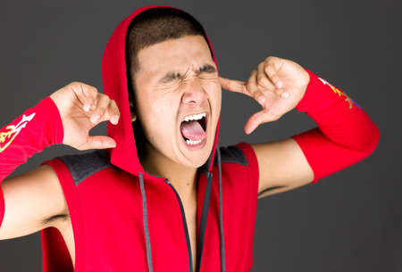 Young Asian man wearing white shirt shouting because of anger. Close up head and shoulders, monochrome black white image