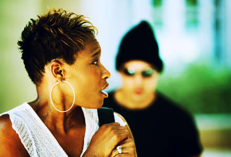 Man in hoodie robbing and threatening with gun to frightened young woman. criminal and robbery for woman concept.