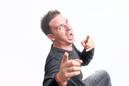 Young man screaming and pointing his finger at the camera on a white background