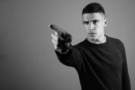 Young handsome man wearing sweater against gray background