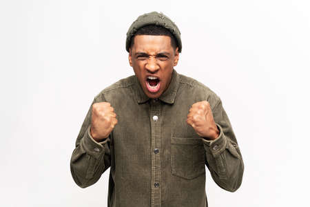 Latin man aggressive fighter holding clenched fists up ready to boxing, martial art trainer. Indoor studio shot isolated on white background