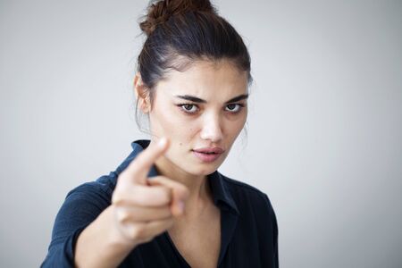 Angry woman pointing isolated on gray background