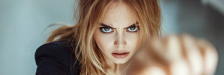 Portrait of a Young Woman with Intense Blue Eyes, Experiencing Anger, Shallow Depth of Field
