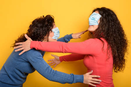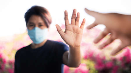 Relationship of People during Coronavirus Concept. Person with Surgical Mask making Stop Sign Gesture while another one need to Closer. Stop Epidemic Diseases