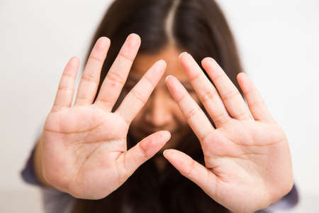 The young girl, crossing her arms, shows a forbidding gesture. Stop domestic violence.