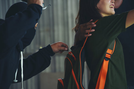 Afraid young woman giving money to a thief on the street. Rear view of an armed criminal stealing from a victim outdoors