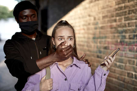 Criminal stalking female alone in a dark street alley, closing her mouth, ask to keep silence. African american guy in mask is commiting crime. Frightened female is standing with widely opened eyes