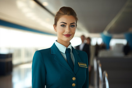 Young female flight attendant standing in an empty airplane cabin, wearing uniform and a friendly smile
