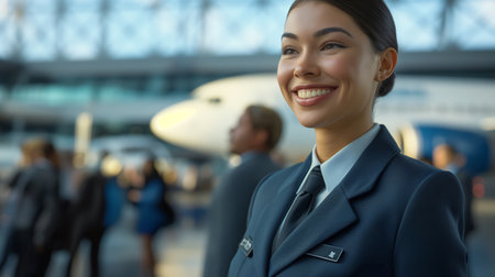 Cheerful female flight attendant standing outdoors at airfield