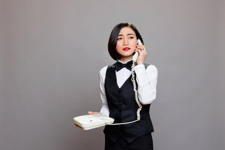 Young confident asian waitress in uniform talking on landline phone and looking away. Serious woman receptionist holding retro telephone and speaking with restaurant staff