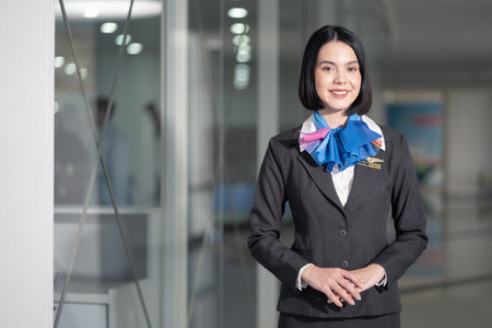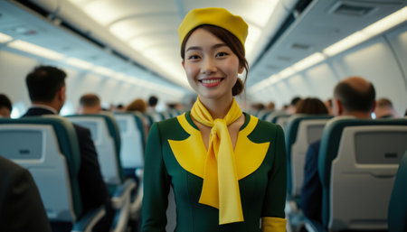 Cheerful asian stewardess in uniform smiling in airplane