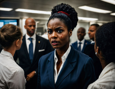 photo of rage angry black air hostess crew woman arguing the other with wound on face, generative AI