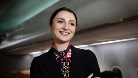 Air hostess. Smiling flight attendant in uniform welcomes and guides passengers aboard a modern airplane. Friendly airline staff providing professional service and comfortable travel flight experience