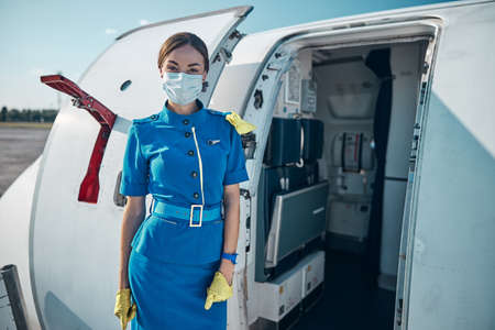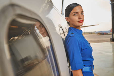 Lovely merry flight attendant standing under the jet engine