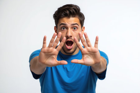 A man in a blue shirt looks surprised with his hands raised in a defensive gesture.