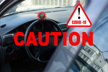 Red headline with inscription COVID-19 on white triangle with virus strain model sitting on the vehicle.