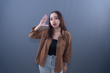 Young Asian woman in brown shirt, black top, and jeans, hand to ear, listening intently