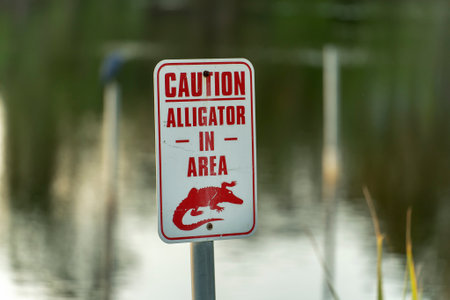 Alligator danger warning signpost in Florida waterfront park about caution and safety during walking near water