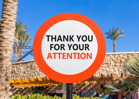 Thank you for your attention symbol. Concept words Thank you for your attention on white road sign. Beautiful palm trees blue sky background. Business thank you for your attention concept. Copy space.