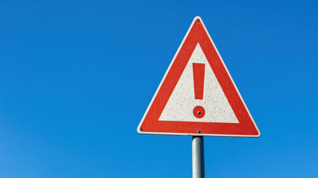 A striking warning sign featuring a bold exclamation point against a clear blue sky, symbolizing danger and safety awareness for various outdoor settings.