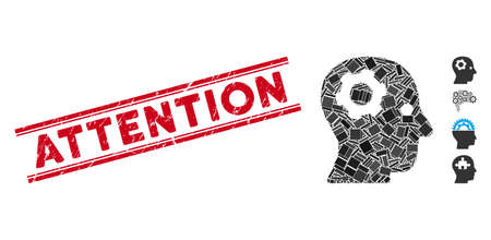 Mosaic thinking gear pictogram and red Attention seal between double parallel lines. Flat vector thinking gear mosaic pictogram of random rotated rectangle elements.