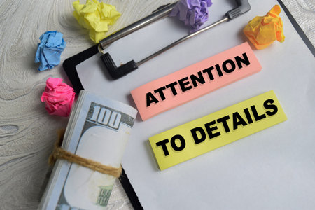 Concept of attention to details write on sticky notes isolated on Wooden Table.