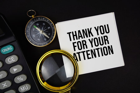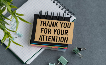 A thank you card is placed on top of a notebook. The card is written in black and white and says Thank You for Your Attention. The notebook is on a table and has a green and white border