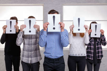 A group of people stand next to an arrow with closed faces sheets with exclamation marks
