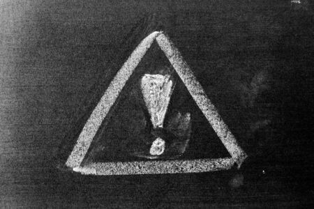 White color chalk hand drawing in exclamation mark with triangle sign shape on blackboard background