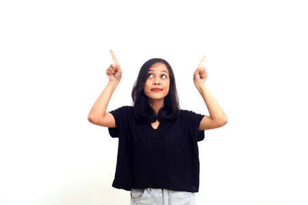Beautiful asian woman in black t-shirt pointing fingers up, standing over white background