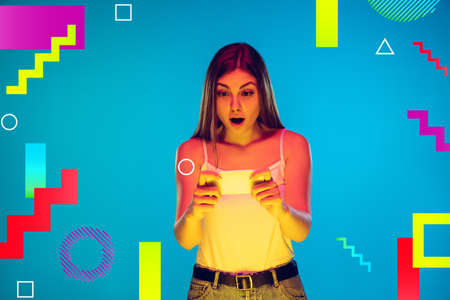Contemporary art collage, modern design. Retro style. Astonished woman on blue studio background in magazine style