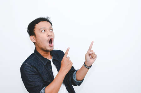 Wow and shock face of young Asian man in white shirt with hand point on above empty space.