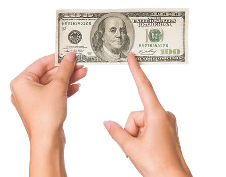 Close up hand holding money of one hundred dollar bills isolated on white background. Hand giving money of one hundred dollar banknotes in financial, money exchange and donation concepts.