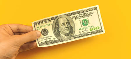 Finance investment concept, man hand hold one banknote, one hundred dollar bill on yellow background of business desktop