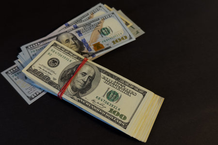 One hundred dollar bills on black background