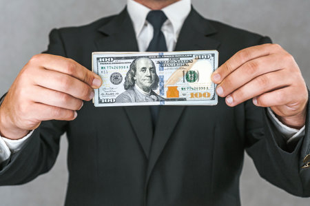 Close-up, American dollars money in the hands of a business man. White and gray background