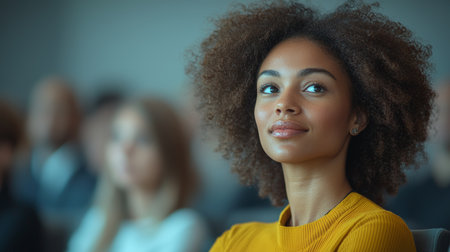 Young african american woman looking away while sitting in conference hall