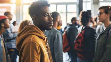 A young man isolated in a sea of students portraying loneliness. Concept Loneliness, Isolation, Young Man, Students, Emotional Portrait