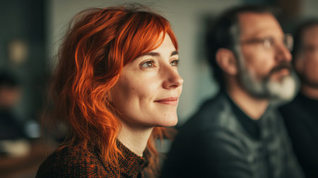 A professor with vibrant red hair is thoughtfully engaged in a multidisciplinary research discussion with colleagues in a modern academic setting.